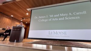 Le Moyne College has announced a record $12 million gift by James Carroll, Ph.D., a graduate of the class of 1966, that will name the College of Arts and Sciences at Le Moyne. The announcement was made to faculty, staff and students at an on-campus event on Tuesday, March 26.