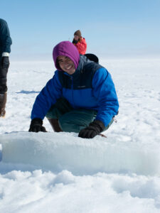 Vielma examines a freshly extracted ice core sample on the Arctic Sea ice in Barrow, Alaska.