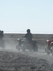 As they ride ATVs across the Barrow tundra, participants in the Arctic Summer Internship Program keep a respectful distance from a polar bear in the area.