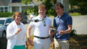 On a nearly cloudless morning, James McGarvey ’24 and Nolan Hillhouse ’23 stood outside of the Madden School of Business, their eyes directed toward the sky as they watched the lightweight drone they piloted sail over their heads. The duo was quite familiar with this particular Unmanned Aerial System (UAS) and so, as they carefully monitored its flight, they offered a running commentary. The drone they used, a DJI Mavic 2, can reach approximately 45 miles per hour and fly at a maximum height of 1,200 feet off of the ground, and has sensors that alert it when it comes within six feet of a stationary object. But most important, for the foreseeable future, it will be a fixture in their day-to-day lives.