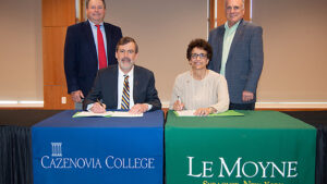 Shown in photo are, from left, Cazenovia Board Chair Ken Gardiner ’81, President Bergh, President LeMura and Le Moyne Board Chair Pete Dilaura ’78.