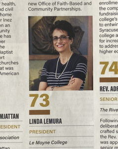 “Linda LeMura made history when she became the first female layperson to be named president of a higher education Jesuit institution in the U.S. With her contract extended through 2026, LeMura plans to continue leading the college through a period of record-breaking enrollment. LeMura oversaw the completion of the largest fundraising campaign in the college’s history, is committed to entwining the greater Syracuse community with the college and has advocated for increasing Pell Grants to address equity issues in higher education.”